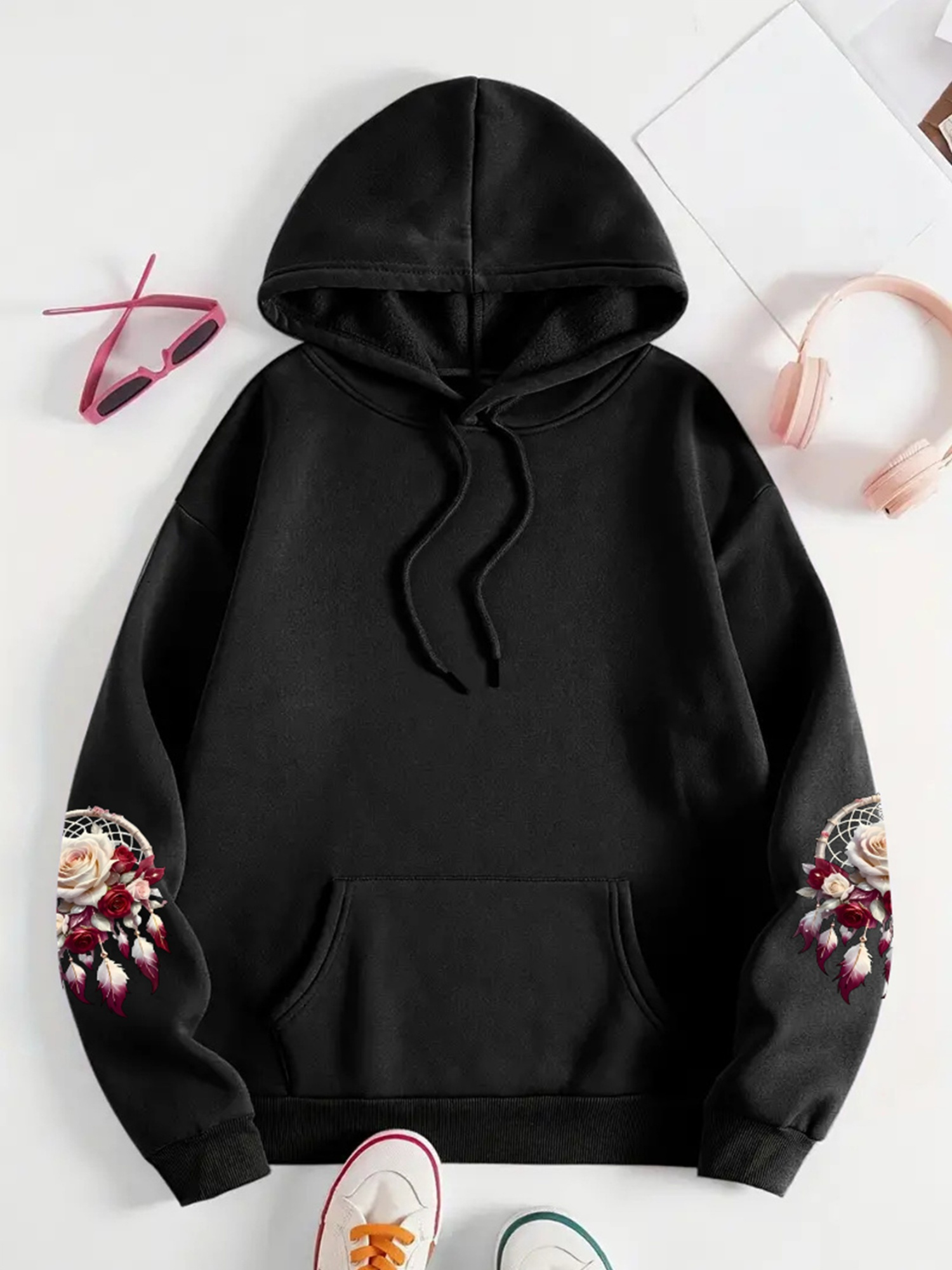 Plus Size - Women'S Plus Size Floral Print Hoodie - Soft, Comfortable Long Sleeve with Pockets, Casual Brown Pullover for All-Season Wear, Casual Wear Hoodie | Floral Print Hoodie | Soft Fabric Hoodie