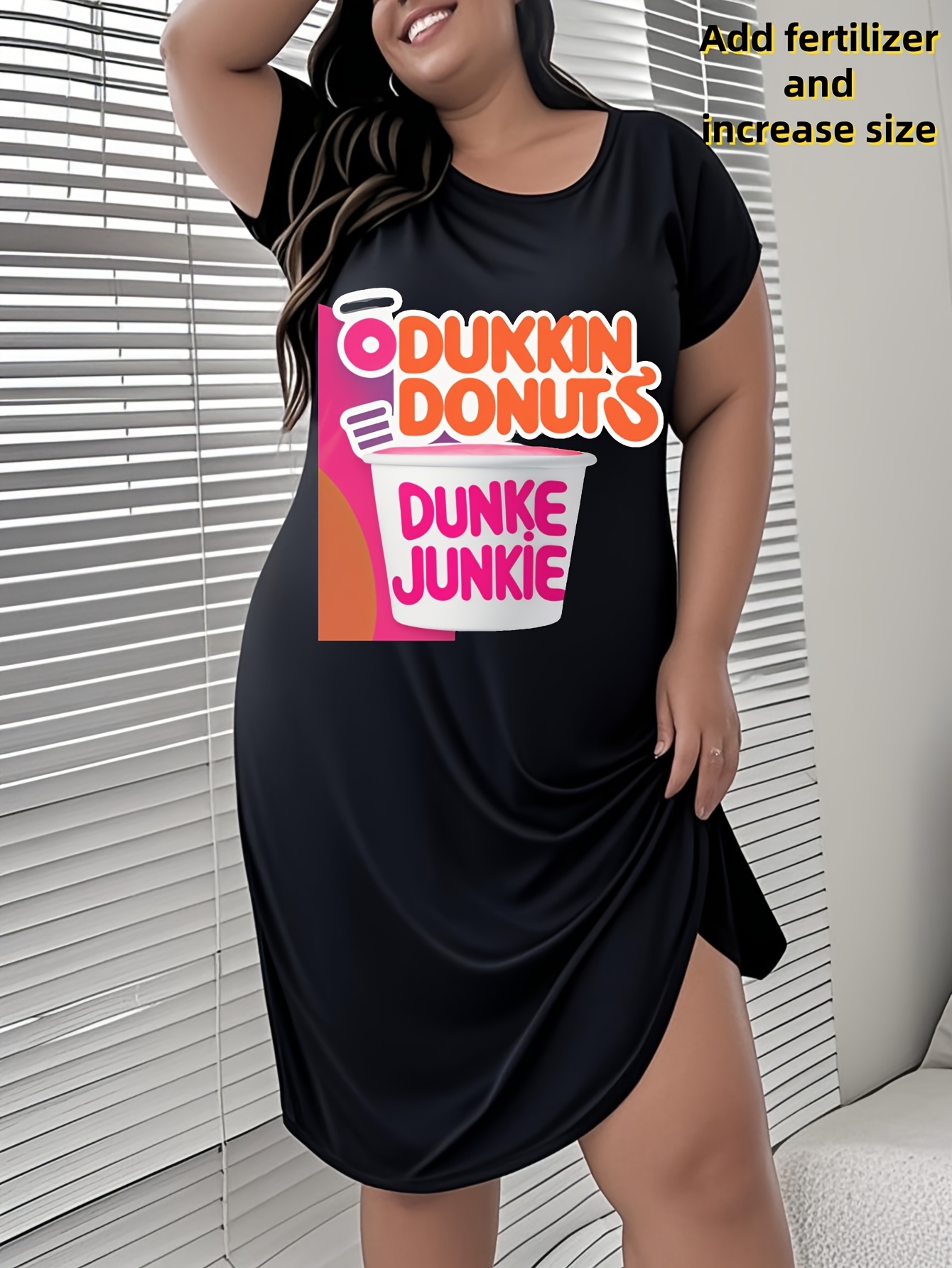 Plus Size Women'S Tops 100% Breathable Short Sleeve Dress with Dunkin Donuts Junkie Print, Perfect for Casual Outings And Everyday Wear.